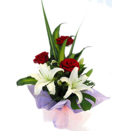 【花材】 花束:3支红玫瑰+2朵白百合+配叶,浅紫色皱纹纸精美包装,粉红色丝带束扎 |