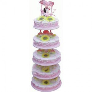 [包装] 购买蛋糕附送贺卡、刀、叉、盘、蜡烛一套,蛋糕最上端卡通模具样式仅供参考。 五层鲜奶蛋糕,太阳花装饰(6寸开始,每层加2寸,共5层) [蛋 糕 说] 祝你们永结同心,百年好合!新婚愉快,甜甜蜜蜜! |