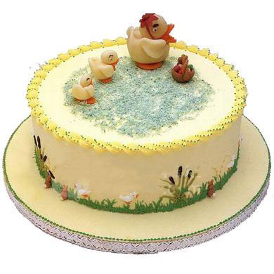 [包装] 购买蛋糕附送贺卡、刀、叉、盘、蜡烛一套 圆形鲜奶蛋糕,米黄色奶油作为蛋糕基色,底部周围用绿叶、小鸭等装饰 [蛋 糕 说] 打开的是吉祥,看到的是鸿运,愿所有期望和祝福涌向你们,祈望全家心情舒畅万事顺意. |