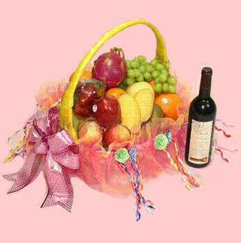 名 称: 中秋果篮/心意 花 材: 苹果、甜橙、葡萄、草莓、火龙果、香蕉、果篮等时令水果组成的果篮,外加红酒一瓶,水果、红酒。 包 装: 果篮 花 语: 一点心意! |