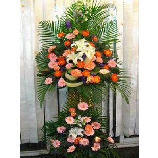【花材】扶郎花、百合等更多鲜花配叶。 【款式】高档豪华2层架式花蓝。高度-1.8米 |