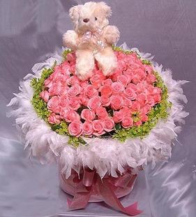 花材:粉玫瑰66朵,加配草,羽毛,皱纹纸包装,赠品小熊一只(小熊随机发)