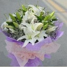 【宝贝描述】:10枝精品香水白百合,配情人草,淡紫色手揉纸和粉色绵纸包装,丝带打结。 |
