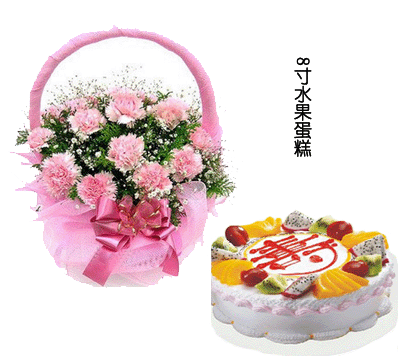 【商品说明】超值配:康乃馨花篮+8英寸祝寿水果蛋糕! 【商品名称】孝子/孝女送福 |