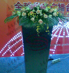 WG2179-精选昆明香槟玫瑰18枝,白色洋桔梗10枝,黄色跳舞兰8枝,粉色百合3枝,插瀑布型讲台花,适合商务会议嘉宾演讲台布置。 |