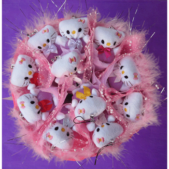 数量: 11只hollekitty 颜色粉白色 花束:高为30 直径为26 圆款 发货方式:快递发货,全国包邮,惊喜吧 包装:不用多说了!这样完美的花束!谁买到就是幸福了! |
