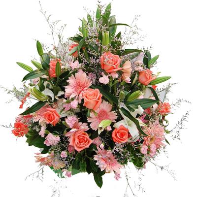 【花材】 22枝粉玫瑰、10枝粉色非洲菊、8枝多头粉色康乃馨、6朵白香水百合、情人草。白色手提花篮,粉色花结装饰 |