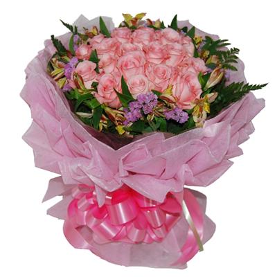 【花材】21枝粉玫瑰,水仙百合外围,勿忘我外围,配草。淡粉色绵纸多层卷边圆形包装,粉色丝带束扎,圆形花束。 |
