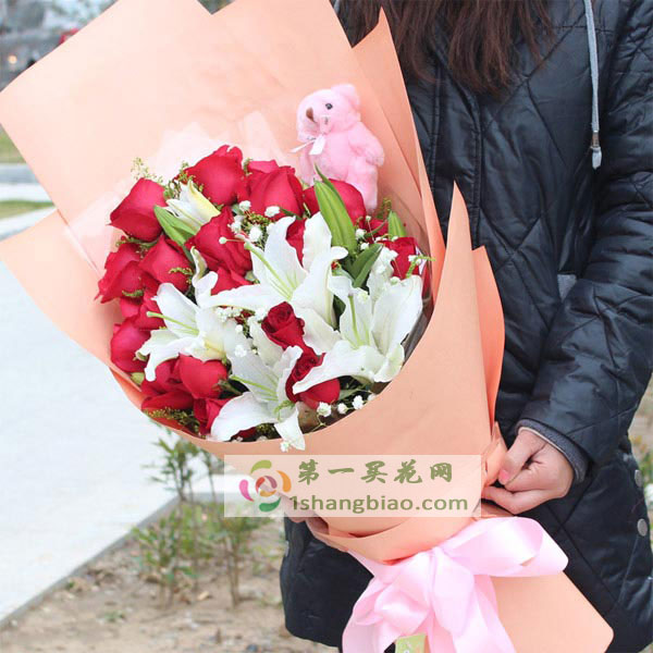 【花材】:19朵红玫瑰+3枝香水百合+1个小熊+黄英、满天星 |