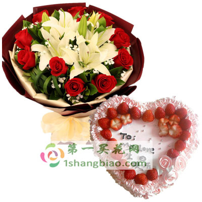 材料:11朵红玫瑰+3支多头香水百合百合 包装:咖啡色包装纸圆形包装,精美蝴蝶结 8寸心形水果蛋糕,表面写“to my love 生日快乐”,送刀叉盘子蜡烛一份 |