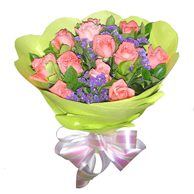 【花材】 12枝粉玫瑰+紫色勿忘我+绿叶+绿色皱纹纸圆形包装+粉色丝带 |